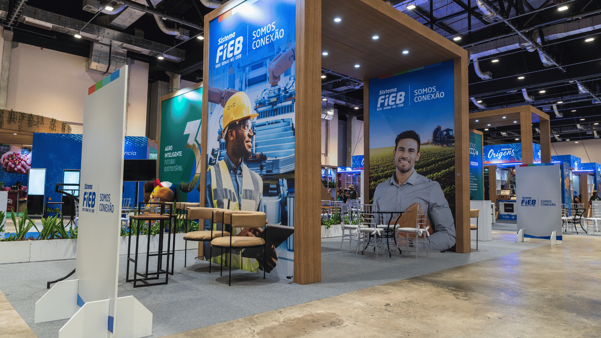 Executamos desde stands personalizados até a montagem completa de pavilhões, incluindo salas de apoio, áreas VIP, camarotes, camarins, credenciamento, plenárias e todos os espaços que fazem o evento acontecer de verdade.