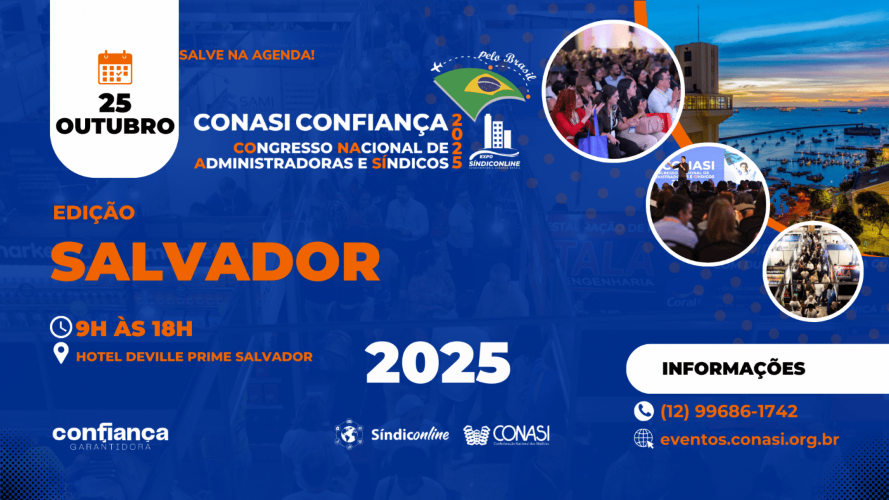 O Conasi - Congresso Nacional de Síndicos 2025 acontecerá no dia 25 de outubro, no Deville Prime Salvador, reunindo os principais profissionais e empresas do mercado condominial do país. Reconhecido pela tradição e inovação, o evento promove capacitação de alto nível e fortalece a conexão entre empresários do setor e síndicos, administradores e demais interessados.