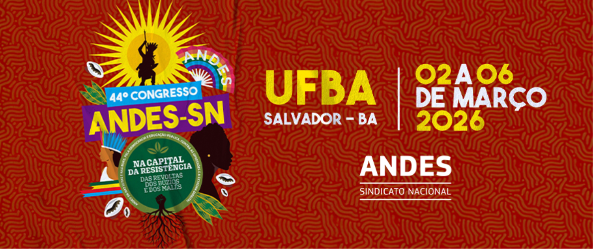 Entre os dias 2 e 6 de março de 2026, será realizado o 44º Congresso do ANDES-SN na Universidade Federal da Bahia (Ufba), em Salvador (BA), com o tema central “Na capital da resistência, das revoltas dos Búzios e dos Malês: ANDES-SN nas lutas e nas ruas, pela democracia e educação pública, contra as opressões e a extrema direita!”.